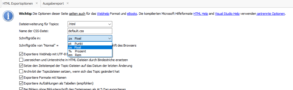 Abschnitt Konfiguration > Exporteinstellungen > WebHelp oder HTML Help > HTML Exportoptionen