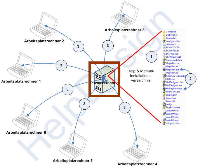 Auf den Arbeitsplatzrechnern eine Verknüpfung auf die HelpMan.exe im Installationsverzeichnis auf dem Netzwerkrechner einrichten.