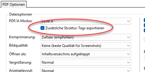 Die PDF/A-Ausgabeoption enthält eine neue Einstellung für Barrierefreiheits-Tags (Abschnitt 508-Konformität). Diese Option erstellt derzeit eine grundlegende Dokumentstruktur, jedoch nicht mit der erforderlichen Granularität. Wir werden diese Funktion mit einem der nächsten Updates verbessern, um die PDF-Ausgabe vollständig Abschnitt 508-konform zu machen.