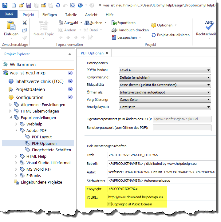 Im Gruppierungsfeld Dokumenteneigenschaften für Copyright und URL Werte eingeben, ggf. Option Copyright is Public Domain wählen