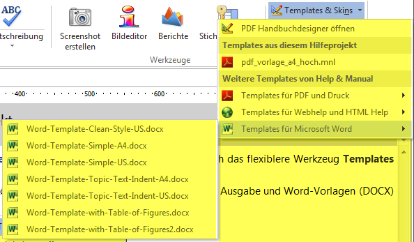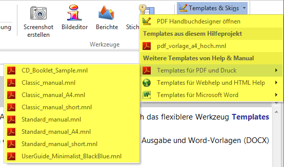 Das Werkzeug Handbuch Designer im Menüband Projekt > Abschnitt Werkzeuge wurde ersetzt durch das flexiblere Werkzeug Templates & Skins.