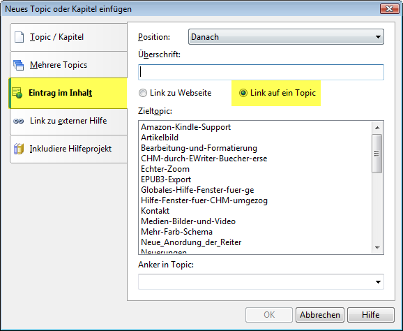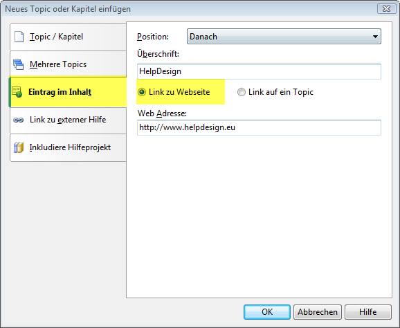 Jetzt ist es möglich, im Inhaltsverzeichnis einen Eintrag auf eine Internetadresse oder ein Topic im Projekt einzufügen.