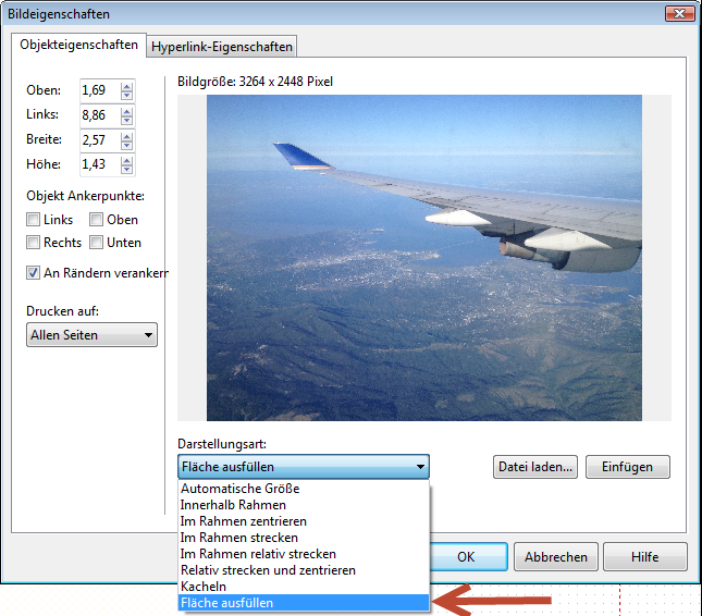 Diese Darstellungsart sorgt dafür, dass ein Bild die gesamte Fläche des Containers ausfüllt, in dem sich das Bild befindet. Damit ist es z. B. möglich, ein Bild auf der Umschlagseite seitenfüllend einzufügen.