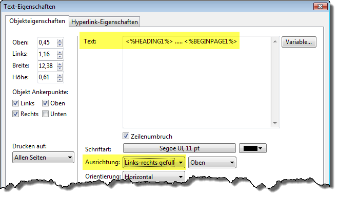 Folgendes z. B. eingeben: <%HEADING1%> ..... <%BEGINPAGE1%>