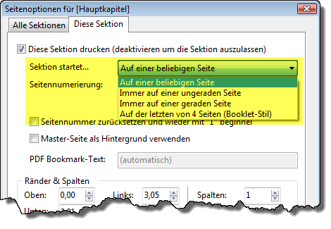 Dropdown-Liste Sektion startet eine Seitenumbruchoption wählen